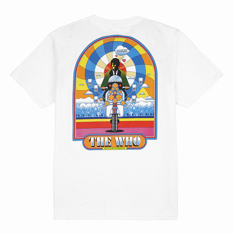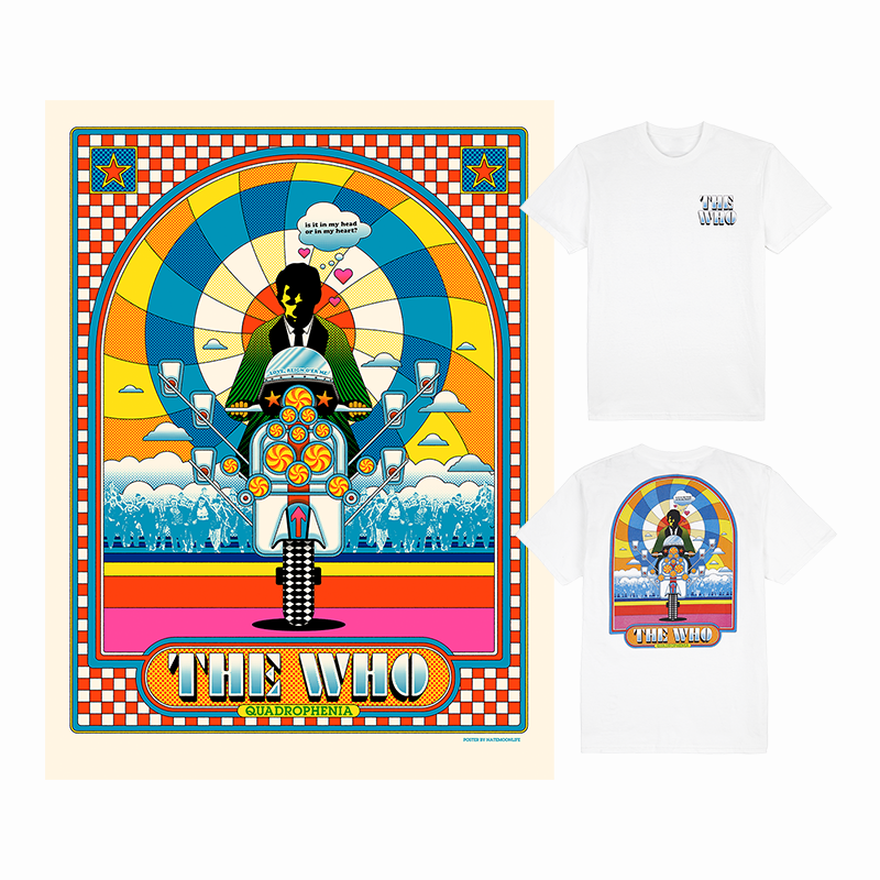 ABOUT THE DESIGN: This poster draws inspiration from The Who's album and movie "Quadrophenia," channeling the vibrant "Mod" subculture that defined the era and the characters throughout. The moped, a central symbol of Mod identity and seen throughout the movie, serves as the focal point, surrounded by psychedelic patterns and bold colors that evoke the album’s themes of self-discovery and rebellion. The checkerboard motif and stylized typography reinforce the retro aesthetic, tying together the film and album's visual and cultural essence."